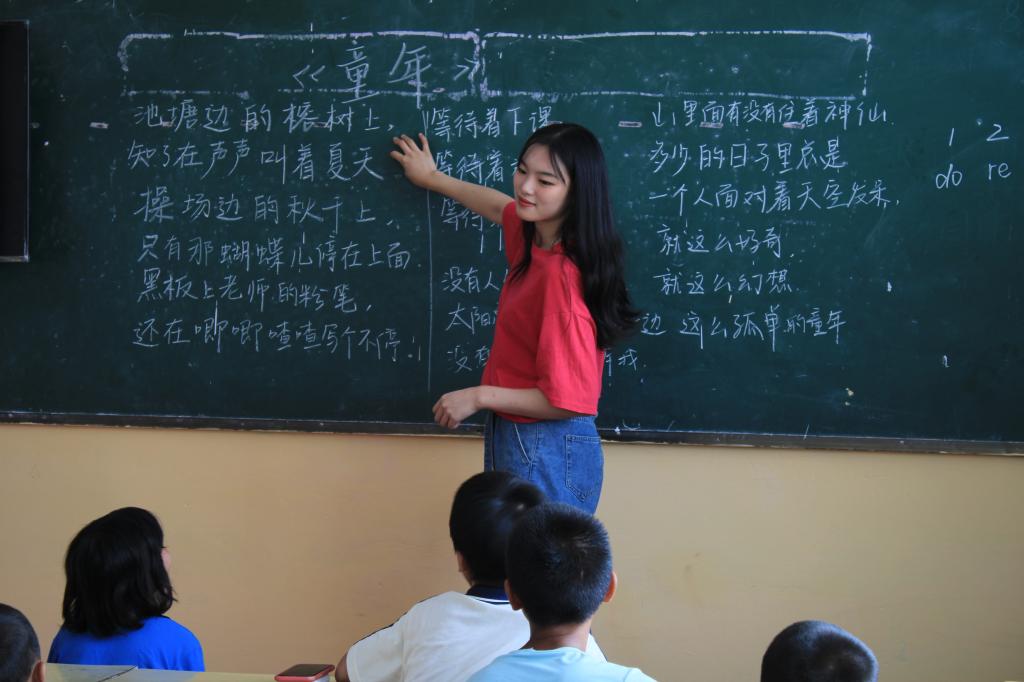 国学课上队员带着孩子一览诗词风采,数学课上带他们走进数独和谜题的世界,美术课上巧用画盘,将青花瓷的传统美意、天青韵味注入画笔,地理课上带着孩子从山川溪流走到江河湖海,在黑板上行过祖国大好河山,英美文化课上讲解放映电影佳作,为孩子们打开世界的窗户,历史课给孩子们播下民族自豪的种子。“不知道还能再为你们做些什么,但我们真心希望你们可以走出大山,去拥抱更广阔的世界。”队员们期盼自己的到来可以在孩子们心中种下一颗小小的种子,让她们更勇敢、更肆意地成长。