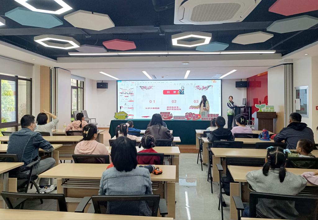 景贤社区作为无锡市少数民族居民聚集的典型社区,依托社区红石榴家园平台,活动在小朋友们热烈的讨论氛围中开始。首先,努尔夏什、王子涵介绍了我国少数民族的基本情况和分布特征,结合自身经历分享了哈萨克族和满族的情况,加深小朋友们对少数民族的印象和理解;其次,课堂互动提问环节,在你问我答的对话中团队成员传授我国的少数民族知识,并以新疆维吾尔自治区为例,观看了民族宣传片,形象展示了少数民族地区淳朴民风与现代建设。