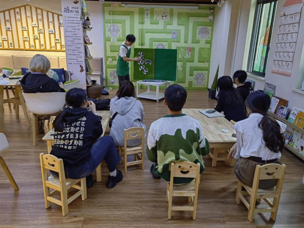 “问心公益人走进老约翰绘本馆”活动期间,在盖中辉和工作人员的指导下,小组成员进行自由绘本阅读,以亲身体验感受到绘本所蕴藏的魅力,并对儿童阅读的意义、特点和方式有了更加深入的认识和思考。紧接着,小组成员通过工作人员以绘本带读、绘本剧场形式的生动有趣的绘本课堂,沉浸式体验了“儿童绘本阅读的快乐”。最后,小组成员深入调研绘本馆的基本情况,包括馆藏、服务内容、发展历程以及市场趋势,详细了解老约翰绘本馆从2012年最初的亲子阅读推广发展到集研学、阅读等为一体的综合性民营机构的模式以及未来发展路径。工作人员介绍到:“绘本馆现藏有2万余种品类的绘本,尽管市场环境竞争激烈,但绘本馆仍不忘初心,一以贯之的将公益理念和文化使命付诸于行动。”在盖中辉的引导下,参访小组成员积极交流、分享自己的感受和理解,彼此启发、互相借鉴,共同提高了对绘本艺术的认识,并感受到了绘本在儿童公共服务、心理治愈等社会工作相关领域的巨大潜力。