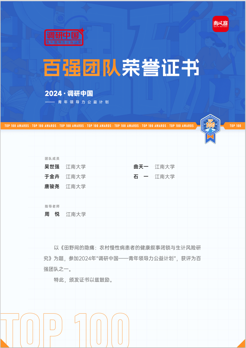 由我院红粉笔支教团成员申报的调研项目《田野间的隐痛:农村慢性病患者的健康叙事闭锁与生计风险研究》从252所高校的623支队伍的激烈角逐中脱颖而出成功入选「2024调研中国」百强队伍。队伍由永利23411集团不同学科的本科生组成,组长为22级社会工作本科生吴世强,成员有23级社会工作本科生于金卉、23级法学本科生唐骏尧、22级临床医学本科生石一、23级物联网本科生曲天一。指导老师为社会学系周悦博士。