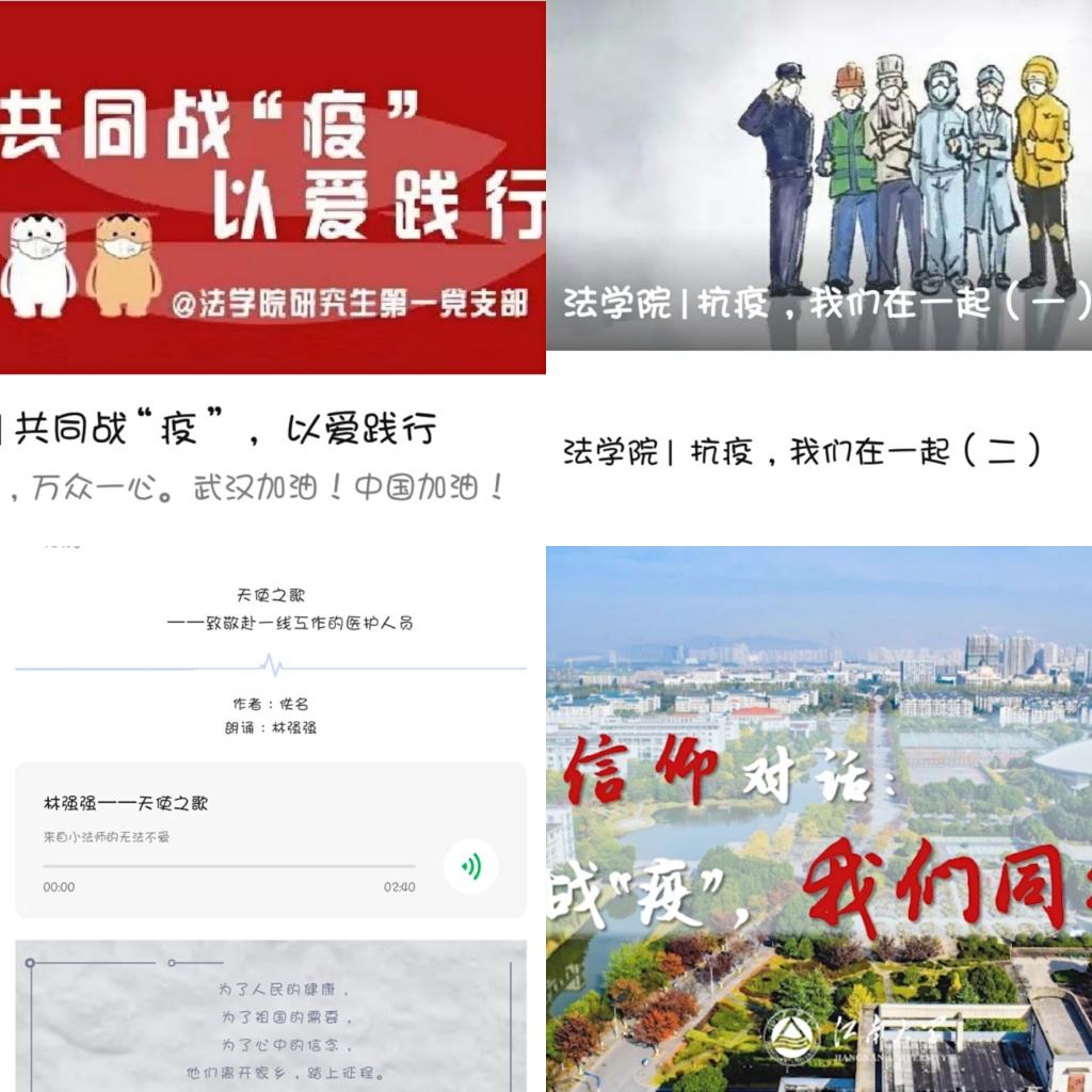 响应习近平总书记“要全面提高依法防控、依法治理能力,为疫情防控工作提供有力法治保障”的重要指示,变成了研究生第一党支部的紧急任务!研究生第一党支部立足专业特色,将自身价值与国家需要相融合,开设《战‘疫’普法》栏目共7期,持续关注疫情,实时更新,以“法”拨开疫情期间的种种迷雾,以法律人的高度责任感和专业精神,全身投入防疫战争,为防疫工作社会法治保障体系提供力量。
