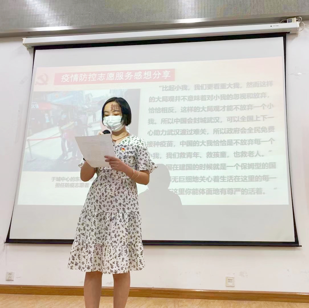 研究生第一党支部党员何镇杰、陈姝雨、谷敏真分别分享防疫志愿服务感想。何镇杰结合无锡地铁集团组织的职能部门志愿活动经历,讲述了青年党员所应培养的“志愿服务精神”。陈姝雨将国内外疫情现状做对比,并表示:“在中国,各级政府事无巨细地关心着生活在这里的每一个人,在这里你能体面地有尊严的活着。疫情这一场考试,中国交出了完美的答卷,河南洪灾同样,不管中国将来会遇到什么,我们都能平安度过,因为中国,是十四亿人的中国。”谷敏真分享疫情期间为家乡留守儿童进行思想引领、课程辅导、心理辅导志愿服务经历,讲述了自己如何依靠专业知识和能力参与到具体实践中。