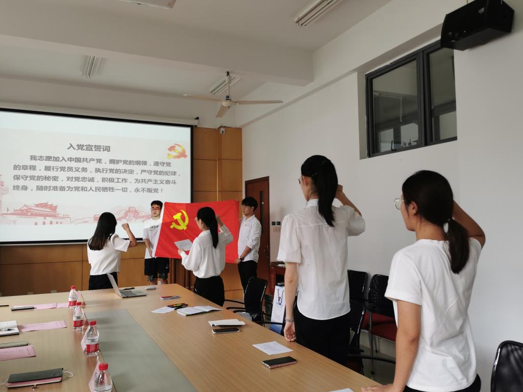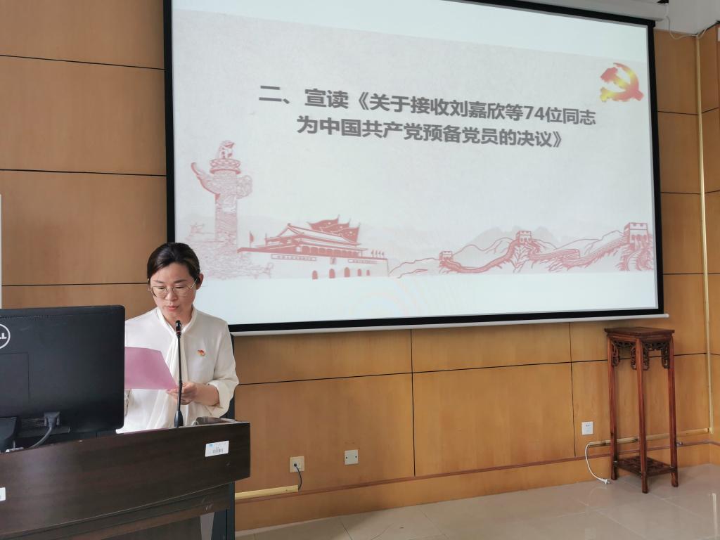 本次入党宣誓仪式在庄严的《国际歌》中开始,张慧琪同志宣读了《关于接收刘嘉欣等74位同志为中国共产党预备党员的决议》。孔潇潇带领74位预备党员面向党旗庄严宣誓,随时准备为党和人民的利益牺牲一切,为党旗再添新彩,为党的事业再立新功。新党员代表于宗楷结合个人递交入党申请书,被列为入党积极分子,再到发展为中共预备党员的心路历程以及自己在思想、入党动机等方面的转变,从提升思想政治修养、发挥党员先锋模范作用、树立终身学习观念三个方面向党组织表达为党和人民终身奋斗的决心;优秀学生党员代表穆妮热表达了自己对党的深厚感情,并表示作为一名党员我们要继续在各方面严格要求自己——刻苦学习,认真工作,克己慎行、严于律己,起好榜样带头作用,努力塑造新时期党员的良好形象,将这一份光荣和责任延续下去。