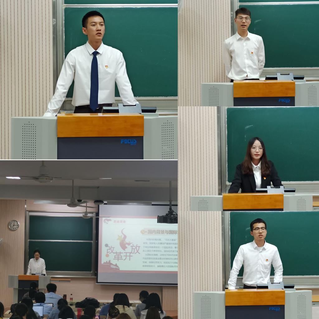 “党员讲师团”成员分别从6个主题进行宣讲,实践“凝聚青年,服务青年,带动青年”青年自我培养体系。孔潇潇主讲“坚持党对一切工作的领导”,从提出过程、主要原因、实践要求、意义作用等方面,阐述了“坚持党对一切工作的领导”的重要性及必要性并表示:“唯有只有党充分发挥全面的整体的领导作用,才能协调各个领域,统筹总揽各个方面。”丛毅竹主讲“全心全意为人民服务”, 追溯“全心全意为人民服务”概念的提出、内涵,结合实际,讲解“为人民服务”是党的根本宗旨,是中国共产党区别于其他政党的根本标志,党的一切工作的出发点和落脚点都是为了实现好、维护好、发展好最广大人民根本利益。邵天勤主讲“坚持独立自主的和平外交政策”,他从鸦片战争开始追溯外交历史进程,重点突出“和平共处五项原则”。结合中美、中俄关系具体阐述独立自主的和平外交政策的基本要义,最后结合时事讲述了如何走出中国特色的外交道路以及我国所坚持的外交政策对国内外的影响。朱强强主讲“坚持四项基本原则”的历史和内涵,表示:“从1979年至2020年,四项基本原则作为立国、治国、强国之本,在改革开放中不断得以巩固和发展,其内涵随着时代的发展不断得以巩固和充实。”燕淇玉主讲“深化改革、扩大开放”,通过讲述改革开放的历史背景与主要内容,阐述改革开放的实质和目的,并指出几十年来,经济实力和综合国力的增强、人民的生活水平的提高,中国最终走出了一条符合国情、顺应时代的现代化道路。未来的中国仍要继续深化改革,扩大开放。周一鸣主讲“坚持党对人民军队的绝对领导”,从人民军队的创建开始,讲述了毛泽东军事思想的形成与发展,着重讲述了古田会议开创我党思想建党、政治建军的光辉道路并强调党对军队的绝对领导,是军队思想政治建设的根本,是我军的军魂和命根子,要永远不能变,永远不能丢。