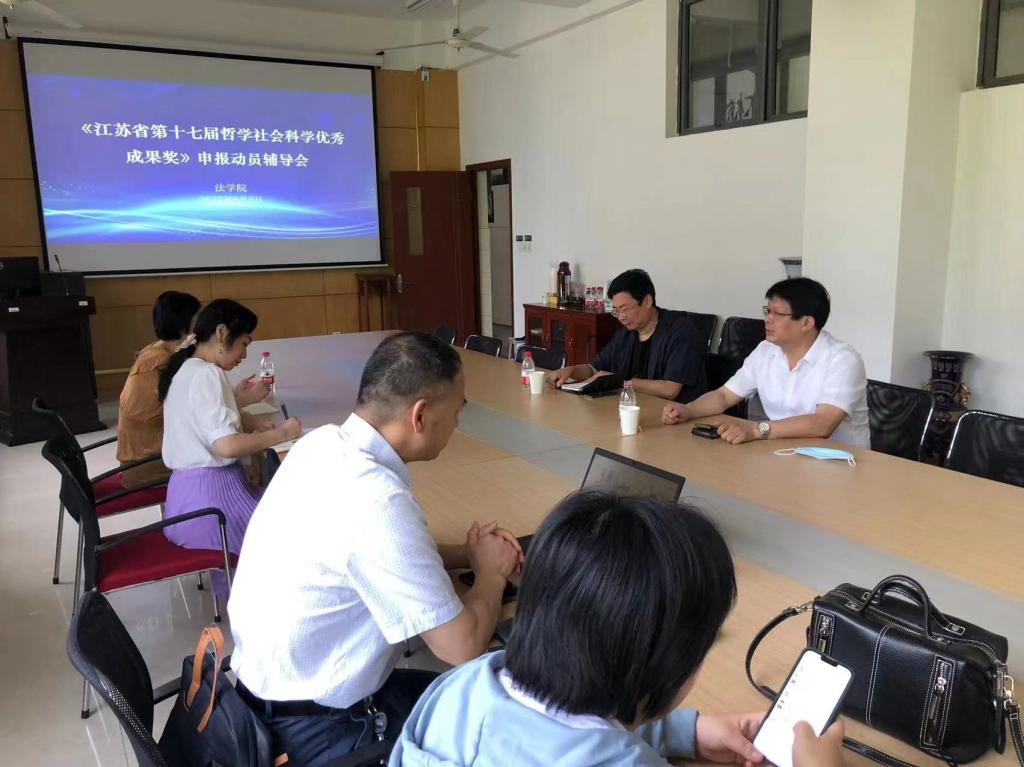 为更好地解读江苏省第十七届哲学社会科学优秀成果奖申报相关政策,提升申报质量,6月8日上午,社会科学处王建华处长、邓嵘副处长、史华伟一行来到永利23411集团,为准备申报此次奖项的老师进行申报动员与辅导工作。