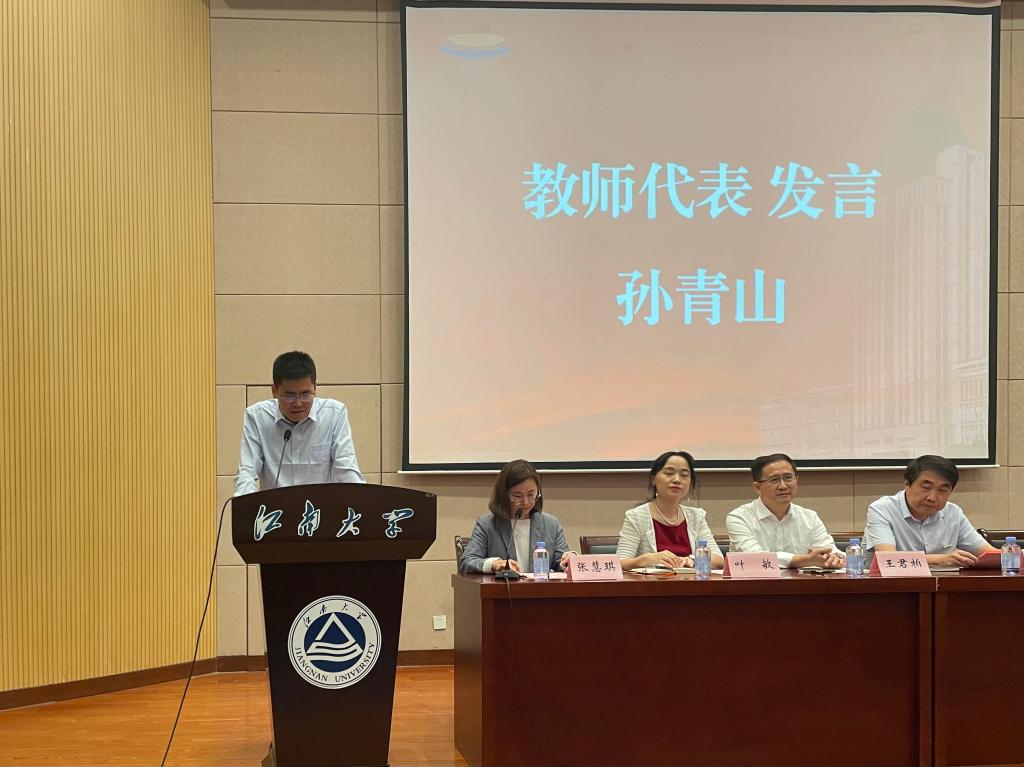 教师代表孙青山发言,他从建立法律信仰出发,提出对待专业学习要学会树立法律身份,善用法律思维思考问题。他勉励同学们珍惜青春时光,成为合格的法律人,用自己喜欢的方式度过一生,找到自己的人生道路。