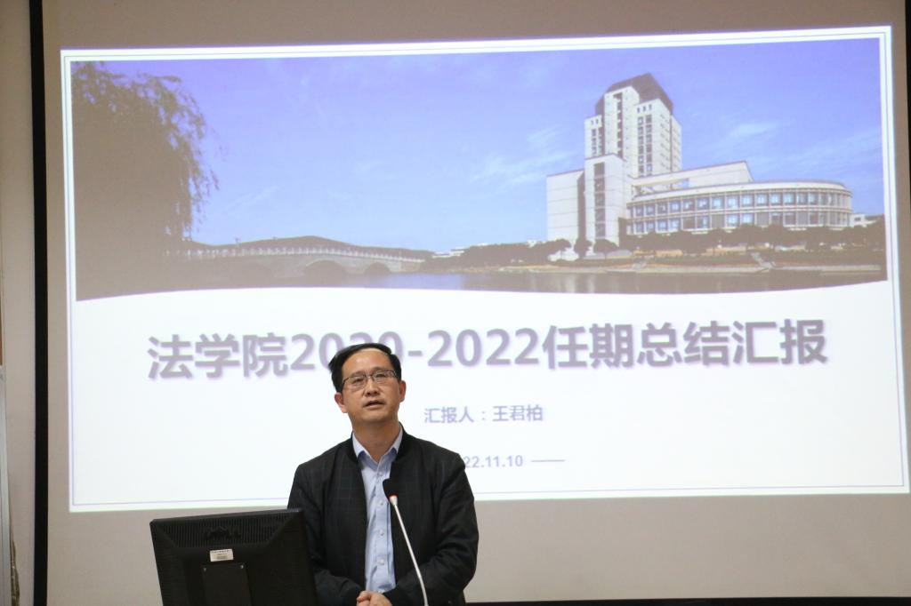 院长王君柏代表学院领导班子作任期目标自评总结汇报,从任期目标对标情况、党建思政工作成效与举措、工作体会与不足四个方面进行工作述职。随后,学院领导班子成员杨杰、王君柏、张慧琪、叶敏、李俏围绕德、能、勤、绩、廉方面针对个人分管工作的履职作用发挥、任务完成情况和未来努力方向等逐一向大会进行述职汇报。