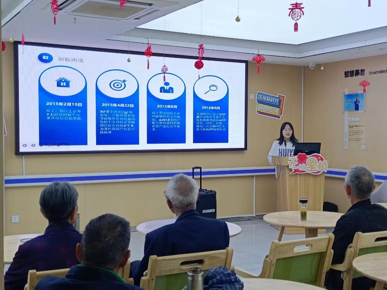 活动围绕《网络安全法》、《继承法》重点内容开展宣讲。首先,团队成员刘冉为老人们科普《网络安全法》相关知识,通过讲解经典案例以及播放案例视频宣讲法律法规,并从日常生活中可能遇到的网络问题引导老人保护自身网络安全。随后,小短片《遗产继承有纠纷,看看赡养谁尽心》引出《继承法》相关法律知识,使老人们意识到继承纠纷已经成为一个普遍存在的社会问题。从法定继承、遗产继承再到两者关系,刘冉从多角度、多层次回答老人们热切关注的继承问题,并为老人们介绍了有关处理遗产纠纷问题的方法。