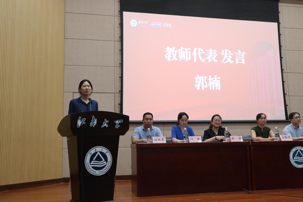 教师代表郭楠发言,她认为同学们要珍惜青春时光,找到自己努力的方向,探寻科学的学习方法,合理分配学习、娱乐与交友时间,用文学、艺术、体育充实生活,练就逻辑思维与独立思考的能力,以己之长回报父母家人、为社会做贡献,为自己的大学留下精彩的回忆,不留遗憾。
