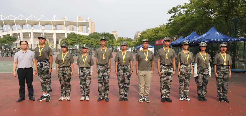 接下来,院长王君柏为电子打靶训练中表现优秀的标兵同学颁发奖牌。最后,院领导为教官与军训新生发放慰问物资。慰问品发放结束后,领导老师以及教官们纷纷移步至体育中心前合影留念,留下了珍贵的回忆。