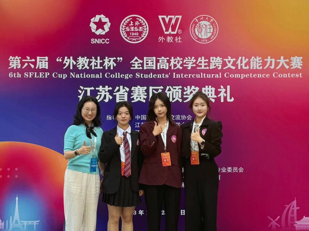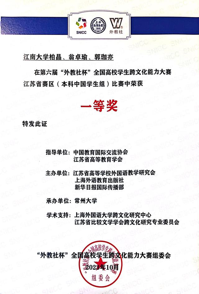 10月28日至29日,第六届“外教社杯”全国高校学生跨文化能力大赛江苏省赛区比赛在常州大学开展。经学校选赛,永利23411集团社工2202班翁卓瑜、郭珈亦与外国语学院英语2101班柏晶代表学校参赛并获得江苏省赛区(本科中国学生组)比赛一等奖。