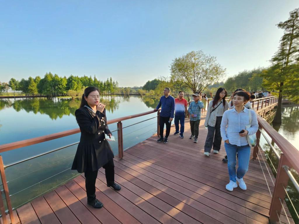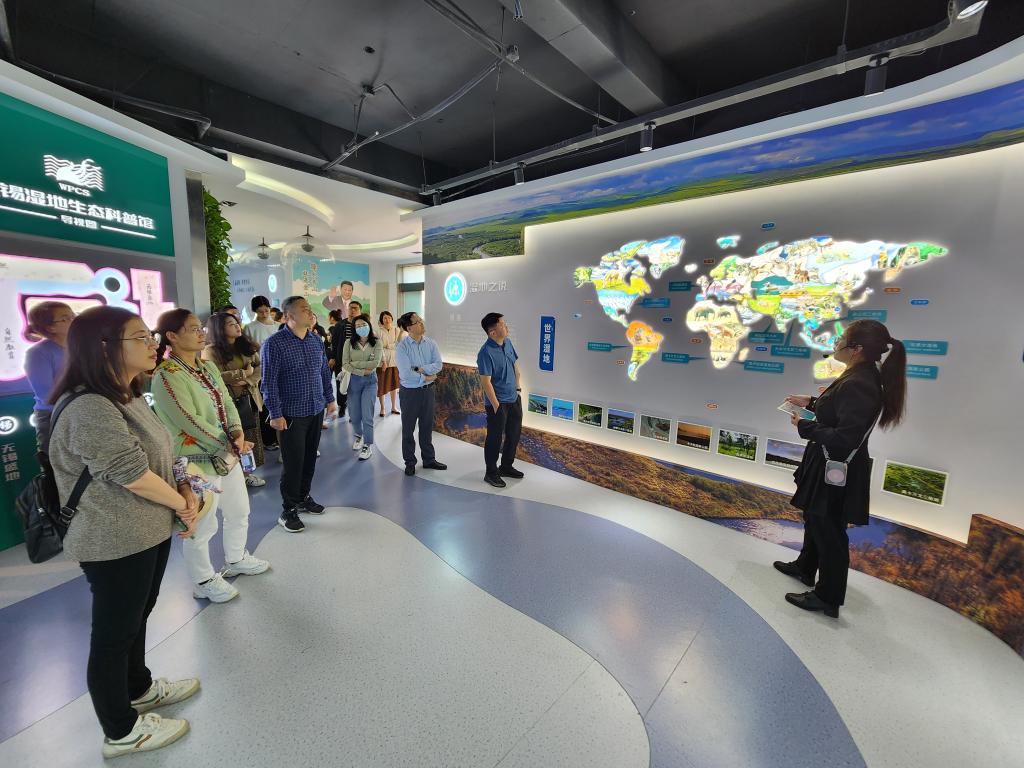 首先,师生一行一起来到无锡湿地生态科普馆。无锡湿地生态科普馆是依照生态文明教育实践基地专门打造,集宣传、科普、教育于一体的湿地生态修复成果展示窗口。在专职讲解员的带领下,永利23411集团师生在集声罩下倾听来自世界十大湿地的鸟叫虫鸣;在太湖治理专区了解太湖水体恢复历程及如何解决由蓝藻带来的居民饮用水问题;在湿地生态互动展厅,结合图片解说和静态标本,了解太湖湿地各种鸟类、虫类、鱼类、湿地植物及湿地微生物;在巨幕投影前观看各类水鸟动态,了解珍稀水禽的繁殖迁徙与湿地的紧密关系;最后在无锡湿地学校风采录,了解湿地保护与学科教育的融合情况,让大家对湿地有进一步的认识,激发大家爱护生态、保护生态的意识。随后,师生们一起参观了无锡湿地生态科普馆西侧的“水上森林”,水面上树木高耸挺拔,水面下湖水清澈见底,森林间有若干小岛通过栈桥连接。专职解说员向大家介绍了水生态系统的构建情况,了解到“水上森林”生态湿地的打造是多年技术积累与自然循环系统共同营造的可喜成果,通过专业讲解,永利23411集团师生亲身感受到了无锡太湖治理久久为功带来的生态福祉。最后一站参观贡湖湾湿地公园这片绿色生态区最具代表性的地方——水韵广场。水韵广场南临太湖,北接贡湖湾湿地,呈现了贡湖湾的新面貌、新气象,展现了生态文明建设的重要性。