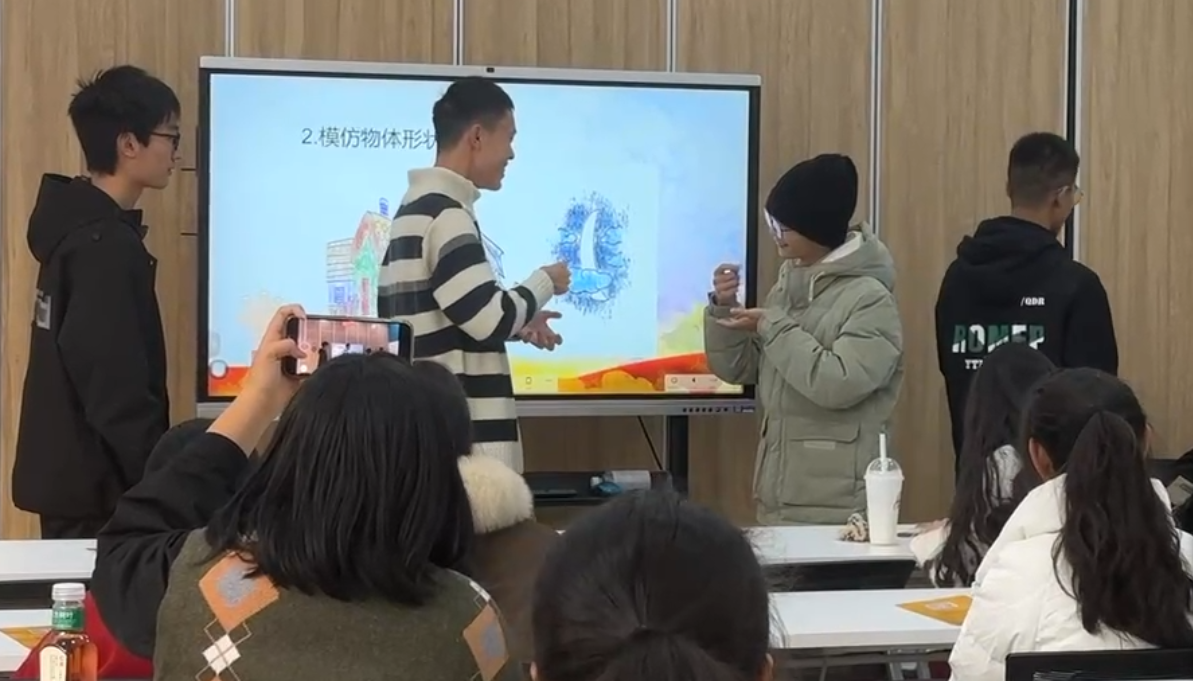 首先,夏沛雯老师介绍了有关“聋人”和手语的相关知识,因文化之间的差异,各国的手语都不相同,但是唯一不变的是对听障人士的尊重与理解。海伦凯勒曾说“盲隔离了人与物,聋隔离了人与人”不仅揭示了“聋哑人”的困难处境,更是点明了手语以及手语普及的重要性。接下来,夏沛雯老师正式介绍手语。在整个过程中,既有老师手把手教学生动有趣的手语实例,也有同学们积极参加考验表达与协作能力的手语猜词小游戏。台上人做着生动的手语,台下人便跟着模仿,“无声”的课堂瞬间活了起来,真是应了那句“此时无声胜有声”!气氛最活跃的环节当属互动游戏环节《你来比划,我来猜》。同学们“手舞足蹈”,利用仅限的手语知识,发挥自己的想象力,比划出纸上文字。尽管是冬日,轻松愉悦的课堂氛围却驱散了天寒地冷,感染了现场的每一个人。在课堂结束后的交流环节,同学们分享了自己对于本次手语课的感受。