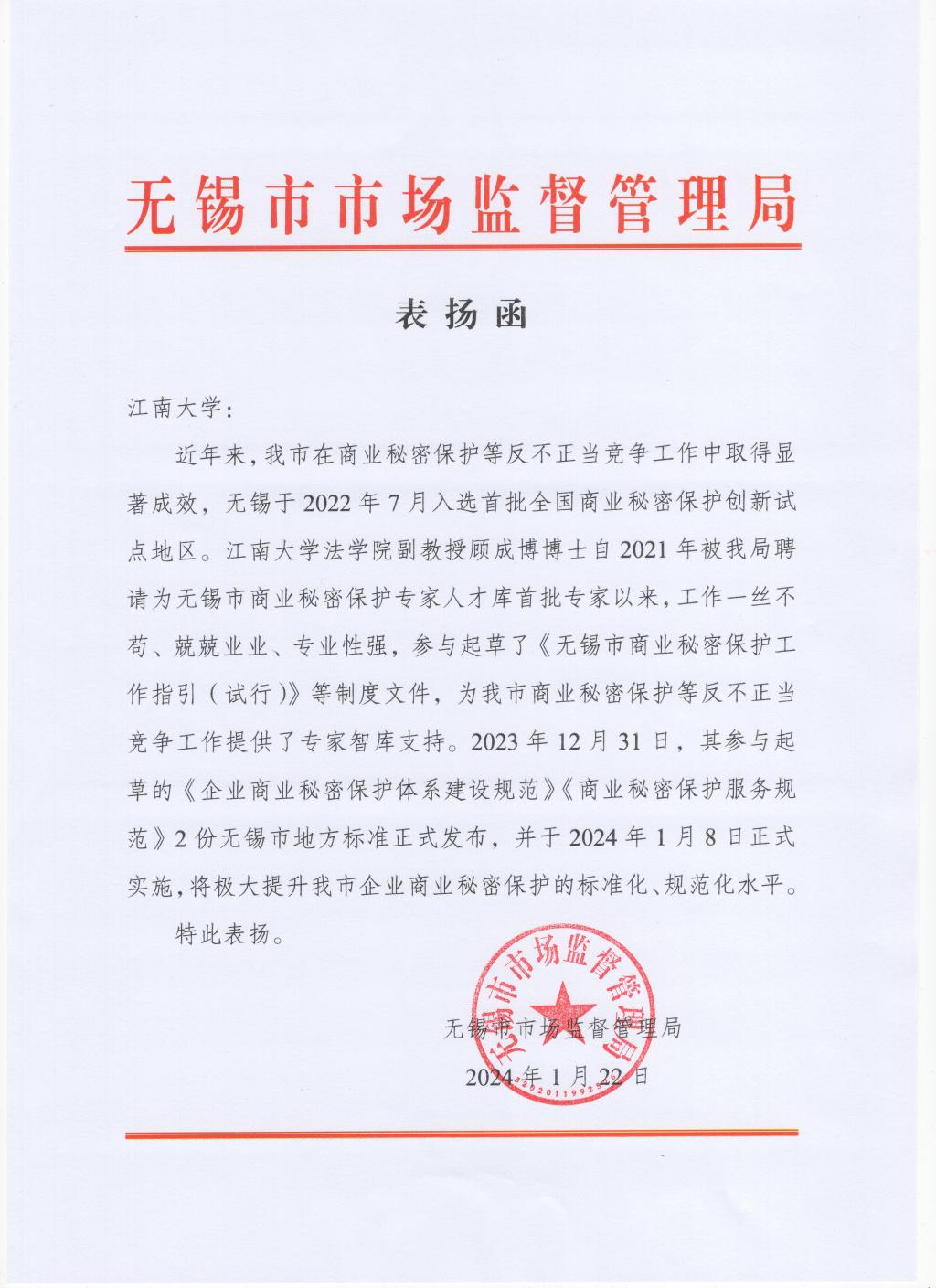 近日,我院收到无锡市市场监督管理局致顾成博副教授的表扬函,对其在商业秘密保护等反不正当竞争工作中的积极贡献予以表扬。