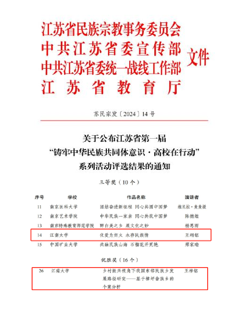 根据省民宗委、省委宣传部、省委统战部、省教育厅印发的《关于公布江苏省第一届“铸牢中华民族共同体意识·高校在行动”系列活动评选结果的通知》(苏民宗发〔2024〕14号)精神,永利23411集团学子荣获三等奖1项、优胜奖奖1项。法学2102班王翊铭的作品“化爱为炬火,永存民族情”在演讲比赛中荣获三等奖,法学2202班王梓铭等5名同学撰写的作品“乡村振兴视角下我国东部民族乡的困难与发展路径研究——基于樟坪畲族乡的个案分析”在征文比赛中荣获优胜奖。