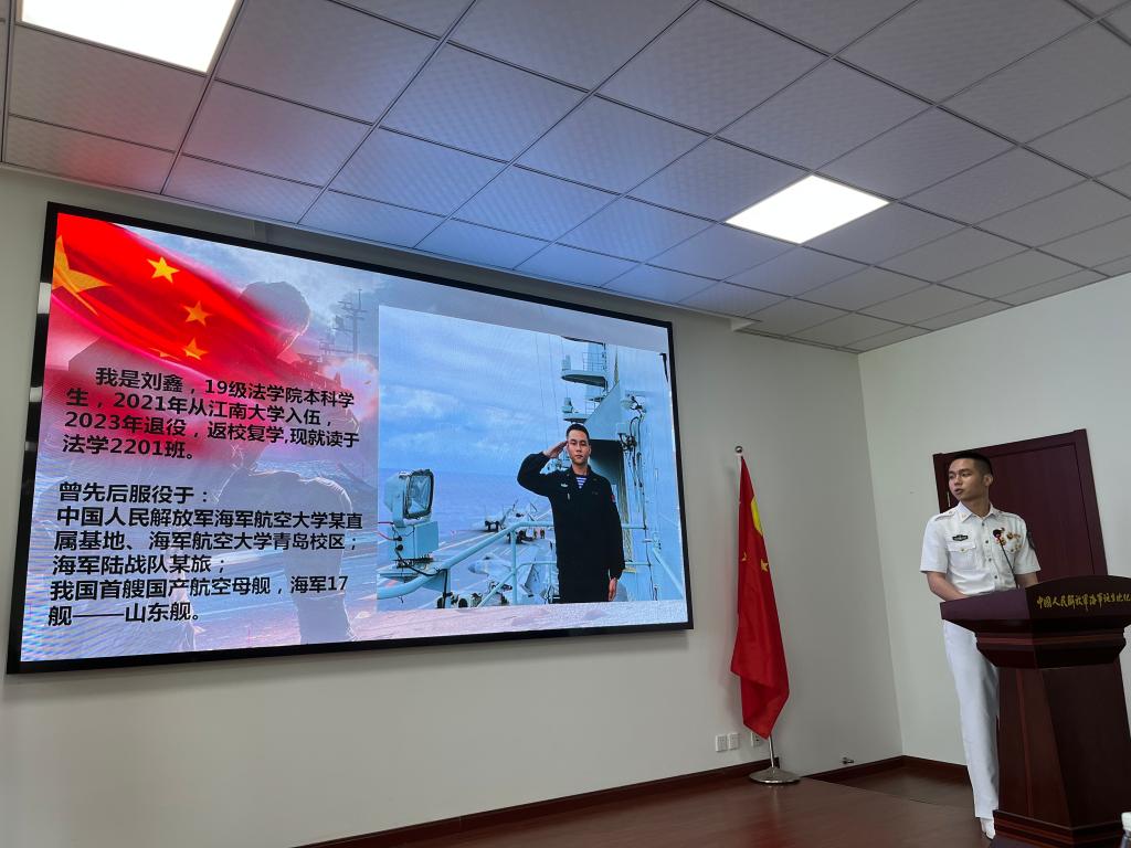 向海图强春潮涌,奋楫杨帆正当时,永利23411集团退伍大学生刘鑫进行“难忘海军蓝”主题分享,他从训练与学习工作、军旅心得感悟、目标打算等多个方面展开,他始终以山东舰舰训“忠诚勇毅,精武致胜”为精神指引,立足自身,发挥力量,将自身命运与国家和民族的前途紧密联系在一起,其爱国之情、报国之志深深感染在场师生。