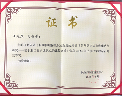 永利23411集团社会学系副教授、国家智能社会治理研究基地研究员汪连杰与武汉大学刘昌平教授合作撰写的研究报告《长期护理保险试点的政策绩效评估、问题症结及优化路径——基于浙江省五城试点的比较分析》荣获国家民政部2023年民政政策理论研究三等奖。