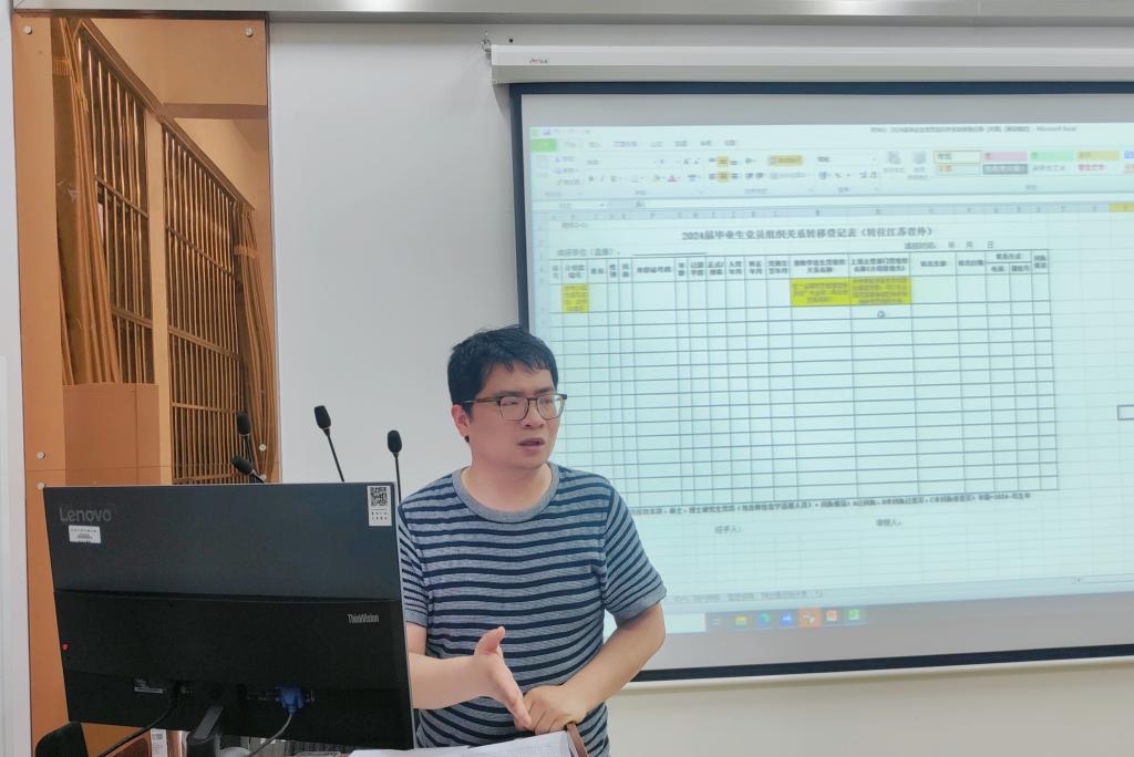 首先,会议围绕“守纪律、讲规矩”展开毕业生党员主题教育,共分为三个部分:第一部分是为何守规律、讲规矩;第二部分是什么是党的纪律和规矩;第三部分是如何做到守纪律、讲规矩。孟飞向毕业生党员们重点强调了学习《中国共产党纪律处分条例》的重要性,指出守纪律和讲规矩是党员必须履行的基本义务,并通过讲解案例形象生动地让毕业生党员们学习党的纪律和规矩的内容以及如何履行和落实。随后,孟飞传达了2024届毕业生党员组织关系转移和党员发展材料归档工作的通知,并进行党员组织关系网上转接工作提醒。他从毕业生党员须知、毕业生党员组织关系的类型、毕业生党员组织关系转移程序等具体工作要求进行毕业生组织关系转移培训,提醒毕业生党员要及时按照指引完成党员组织关系转接手续。