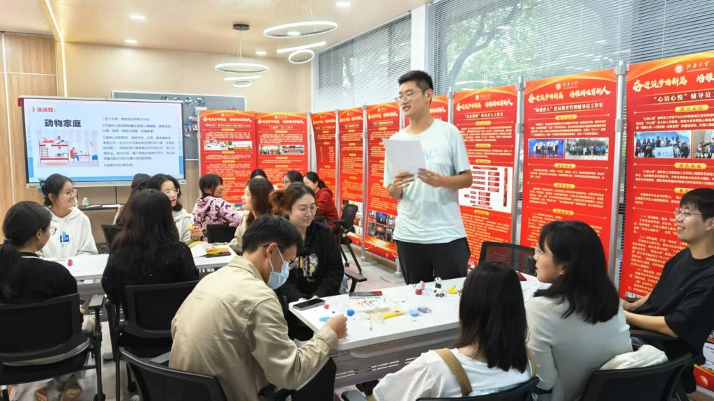 伴随着轻快的音乐,学生们分为4组,围坐在一起进行自我介绍,学生们畅所欲言,说出自己关于在宿舍人际关系上的困惑以及参与到本次团辅中期待的收获。在“抓手指”游戏环节,学生们彼此之间手指与手掌相抵,伴随着一声声“适应”的触发,手与手的相碰,拉近了彼此之间的距离,静默的气氛被欢声笑语打破,变得轻松愉快;在“桂花朵朵开”游戏环节,学生们根据指令,三五成群找队友,在游戏中感受集体的力量;在“捏一个我”环节,学生们选择自己喜欢的颜色,做了和自己有联结的动物代表自己,并分享兴趣爱好、特长以及最近两周欣赏、感谢或兴奋的人和事,学生们深刻体会沟通在人际交往中的重要性;在“动物家庭”环节里,学生们根据自己的喜好按照“宿舍示意图”创建新家,一起制定“宿舍公约”,针对宿舍中最容易产生冲突的要素,进行合理约定并承诺共同执行。之后,徐老师请每位成员在小组中回顾并分享了参加本次活动的收获和感悟。在总结阶段,徐老师指出寝室人际沟通技巧的关键,并提出了一些实用的沟通技巧,同时鼓励大家从现在开始拥抱彼此,拥抱多彩的大学生活,积极拓宽人际交往圈,提升人际交往能力。