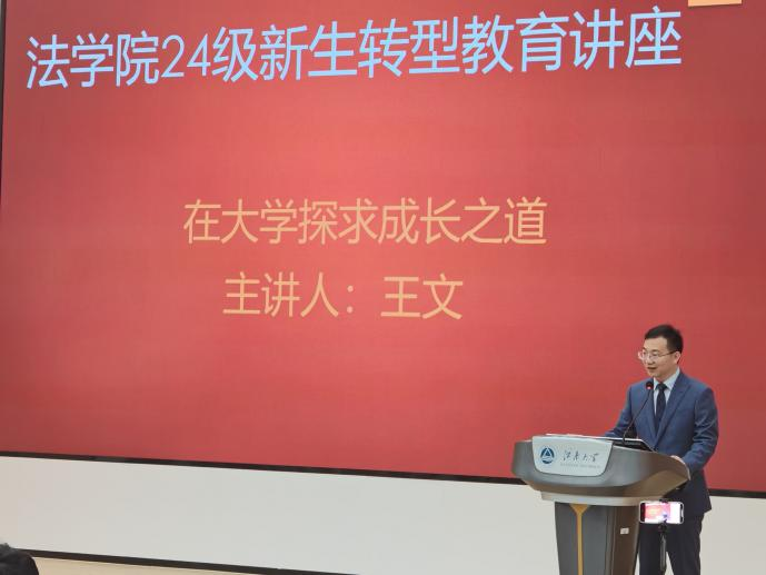 随后,王文以“在大学探求成长之道”为主题,为同学们带来了一场精彩的大学转型教育讲座。王文深入浅出地讲解了法学与社会工作的学科特点、发展前景以及就业方向,让新生们对自己所学的专业有了更清晰的认识和理解。同时,王文还结合自身大学生活感受与经历,鼓励新生们要树立远大的理想和目标,努力学习专业知识,激励同学们积极参与实践活动,不断提升自己的综合素质,为将来成为优秀的人才奠定坚实的基础。对于创业方面,王文也分享了自己的创业经历和心得体会。他从自己曾经制定创业计划、实际考察、落实项目以及创业过程中面临的各种困难为例,为同学们提供了宝贵的建议和指导。同学们认真聆听,不时记录下重要的内容,也对自己的未来有了深入的思考。