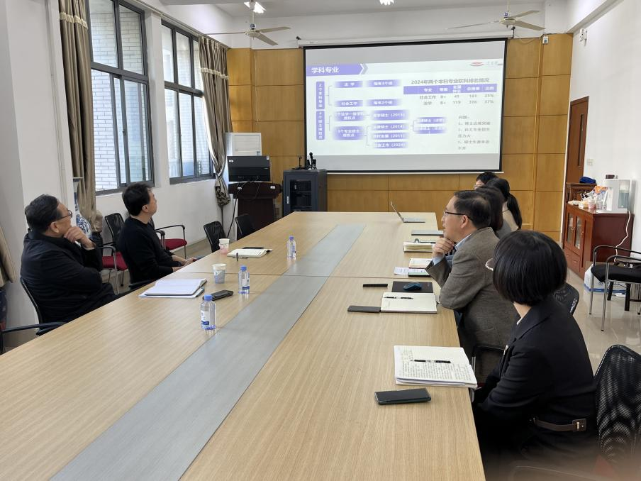 院长王君柏首先汇报了学院基本情况及发展设想,他全面介绍了师资队伍、学科专业、学科平台、科研亮点、社会服务、育人成果等方面取得的成绩及目前存在问题,并就挖掘教师潜力、提升社会服务水平、博士点申报等方面提出未来设想和发展思路。党委书记陆敏芝汇报了学院党委的基本情况,重点介绍了在深化党的政治建设、突出党的思想建设、增强党的组织功能等方面的具体工作举措。提出了加强“一融双高”建设、强化党建工作辐射效应和品牌化建设的下一步工作思路。与会其他领导也分别围绕学生培养、科研管理、教育教学等方面进行了汇报。