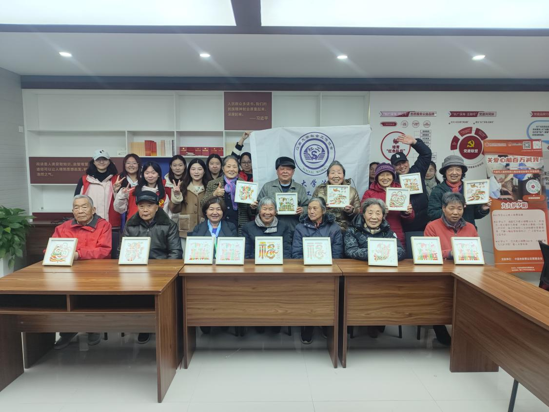 3月18日,同学们在一站式学生社会共同观看养老主题纪录片,感受到长者们的生活现状与社会工作的责任使命。在“长者祝福手作工坊”活动环节中,同学们手绘制作传统百福图并送到社区养老服务中心,将温暖与爱意传递给老人们。在“社工趣味知识竞赛”与“社工树洞”中,同学们进一步深化对社会工作理念的理解,体悟代际和谐的重要社会意义。
