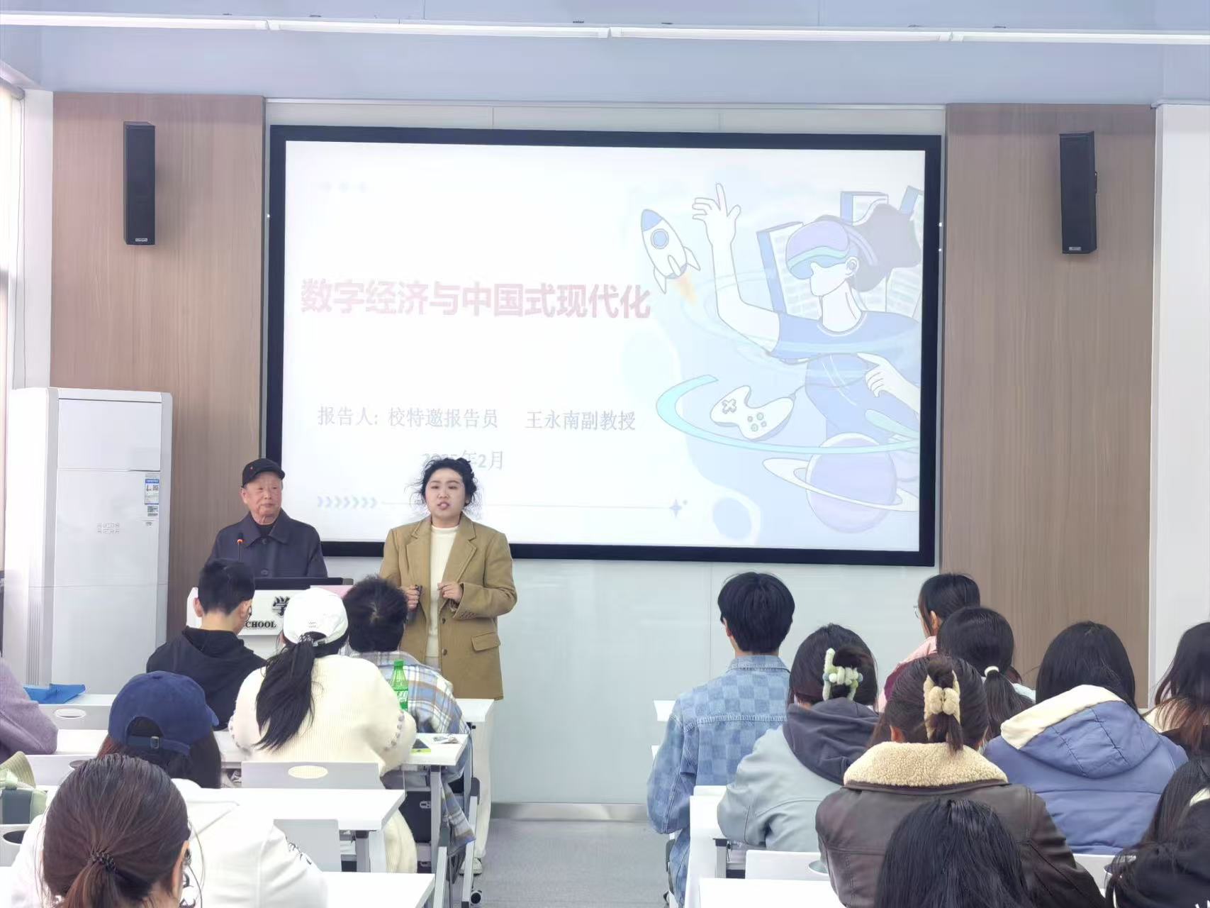 为帮助永利23411集团学子理解时代发展趋势,增强对数字经济发展情况和中国式现代化建设的认识,提升同学们积极投身国家发展事业的主动意识与专业素养,4月2日下午,校关工委特邀报告员、原法政学院党委书记王永南老师开展了“数字经济和中国式现代化”专题讲座,40余名同学参加了本次活动,讲座由党建辅导员缪晶晶主持。