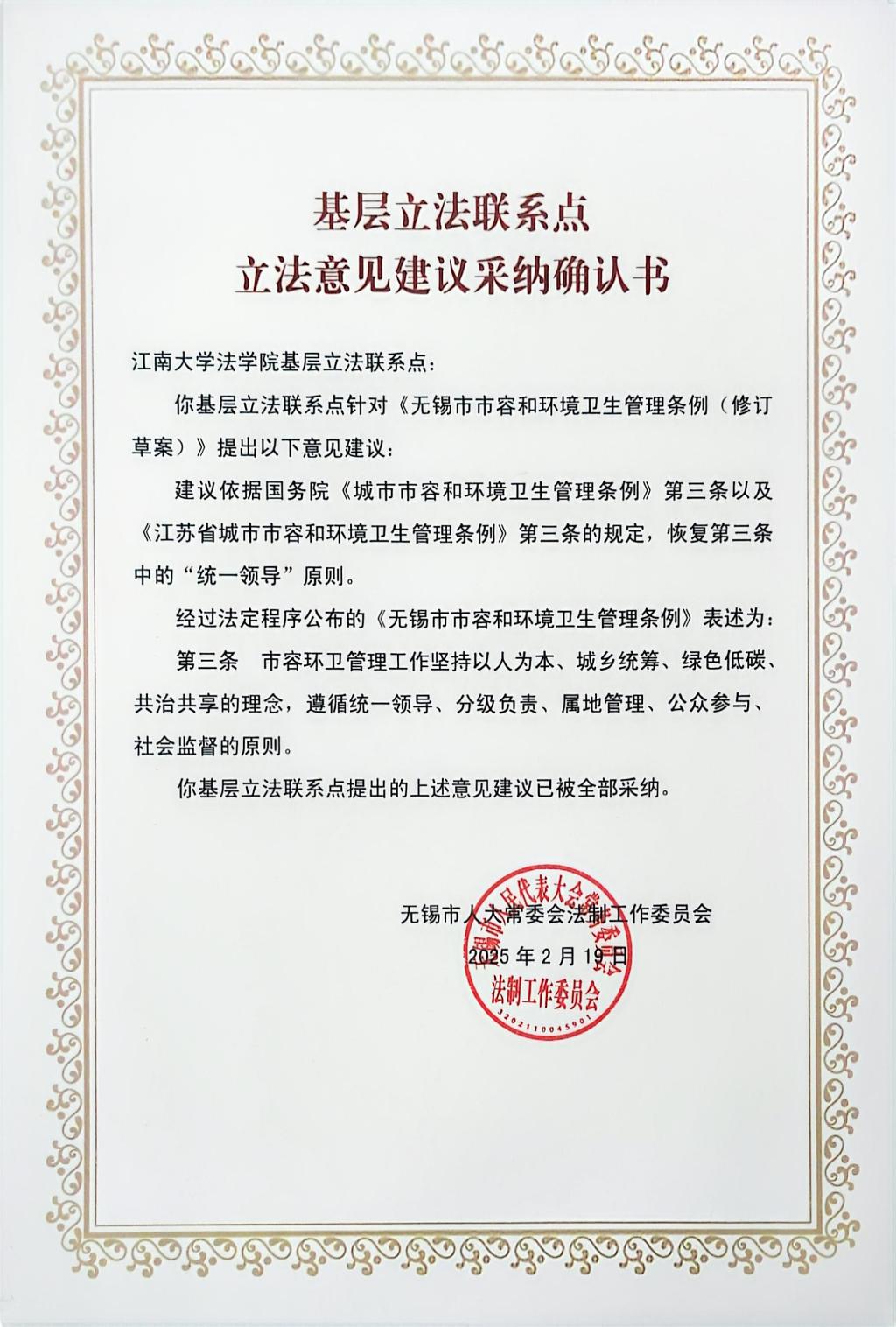 立法意见建议采纳确认书