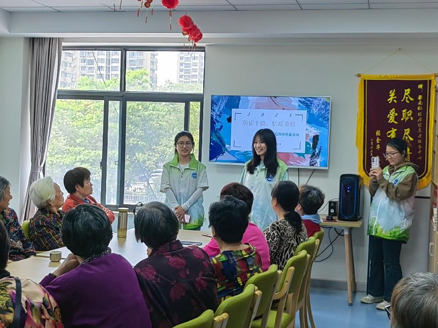 为关爱老年人健康,助力养老服务领域发展,“益治青春”实践团于4月23日下午走进无锡市太湖街道梁南社区居家养老服务中心。此次活动吸引了20余名老人积极参与,团队为社区老人带来认知症的深度科普与温暖关怀。
