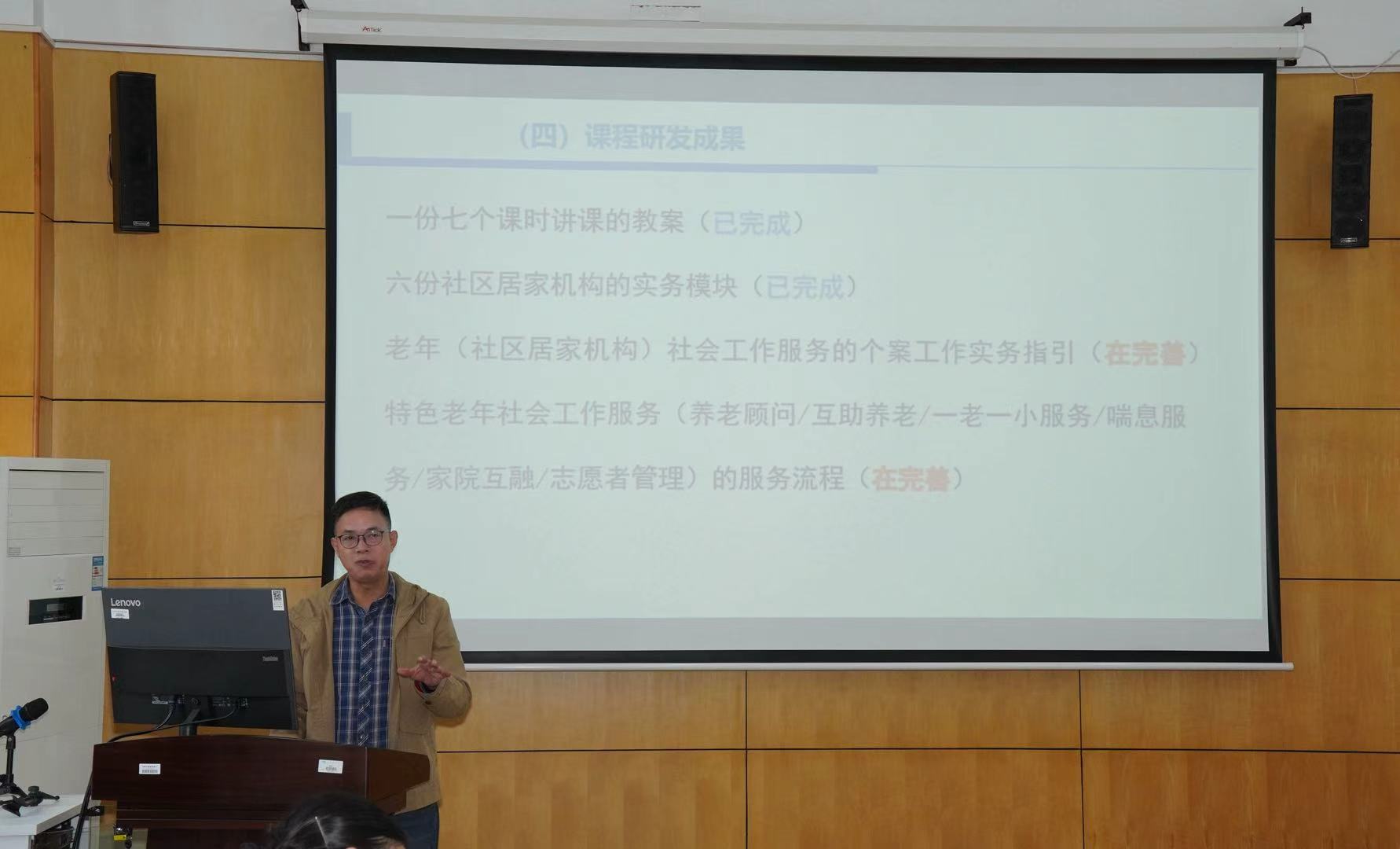在课程研发汇报环节,王金元副教授从课程建设的必要性、研发进展、整体设计思路、阶段性成果以及当前面临的困难与对策等方面,系统汇报了《老年社会工作服务实务课程》的研发情况。在专题督导环节,三位专家从不同维度对课程建设提出具体指导意见。花菊香教授强调课程应明确面向对象,突出实务操作性,以问题解决为主要导向,确保理论方法能有效支撑实践,助力一线社工“学即能用”。张曙教授建议课程应紧密对接国家养老服务体系,聚焦社会工作者在服务中的角色定位与核心能力,并注重融入智慧养老等前沿内容,增强课程的时代性与应用性。龚竹林主任结合基层工作实际,指出课程应着力缓解一线社工的“本领恐慌”,推动政策法规与实务操作相贯通,案例教学与情景模拟相补充,经验分享与问题研讨相结合。专家组一致认为,课程研发应坚持“从实践中来,到实践中去”的原则,切实提升一线社工的专业素养与服务标准化水平。