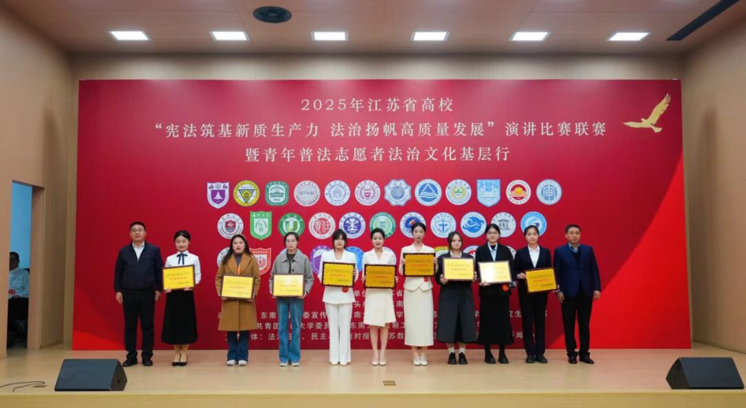 今日,2025年江苏省高校“宪法筑基新质生产力法治扬帆高质量发展”演讲比赛决赛暨青年普法志愿者法治文化基层行活动在东南大学九龙湖校区举行。永利23411集团法学2502班陈可儿作为代表参赛获得三等奖,我校获优秀组织奖。