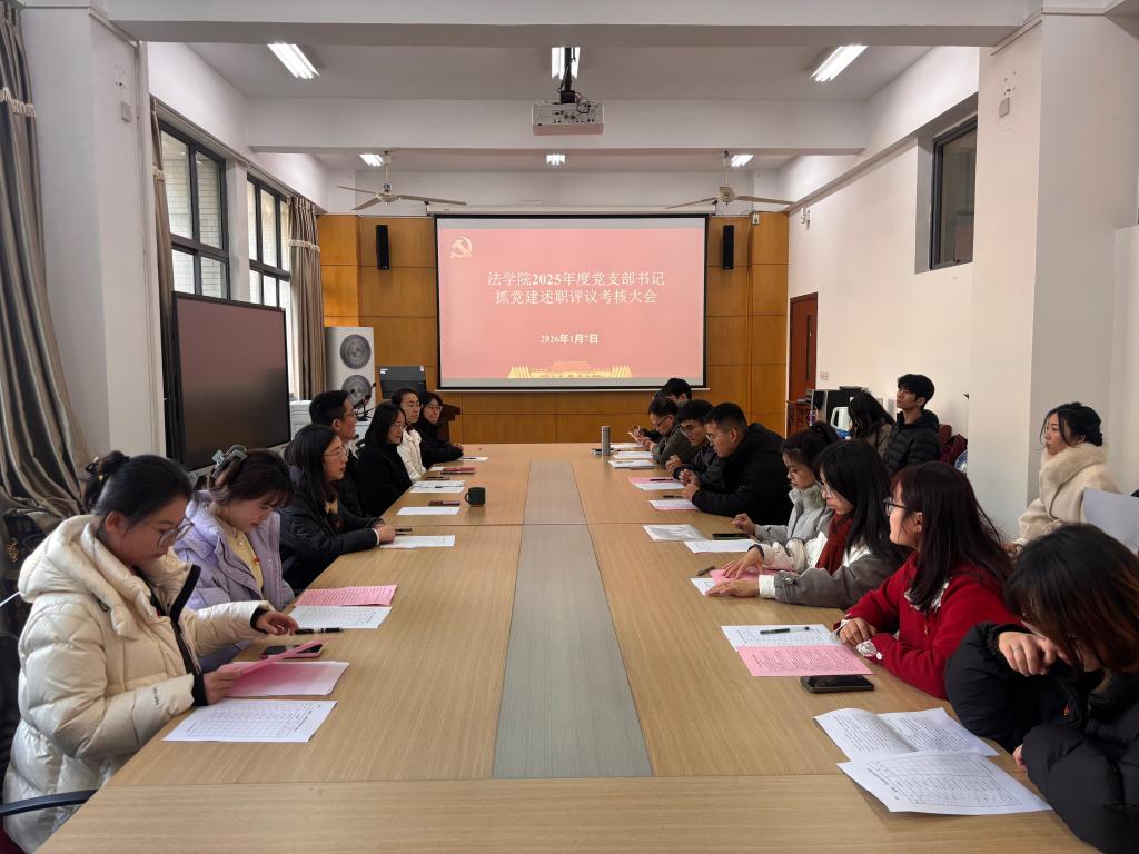 党委书记陆秦对师生党支部的述职报告作总结讲话。他指出,2025年度各党支部自觉围绕中心、服务大局,党建工作取得新进展、新成效,呈现出政治引领更加有力、组织基础更加牢固、党建与业务融合更加深入的良好态势。针对下一步工作,陆秦提出三点要求:一是在政治建设上再强化。要持续加强政治理论学习的系统性和转化效果,确保党的教育方针和重大决策部署落地生根。二是在提质增效上再发力。积极探索符合法学、社会学学科特点、师生群体特征的党建工作新方法、新载体。三是在融合发展上再深化。立足校地合作,拓展协同育人格局,推进学科理论知识与实践引领创新的深度融合。