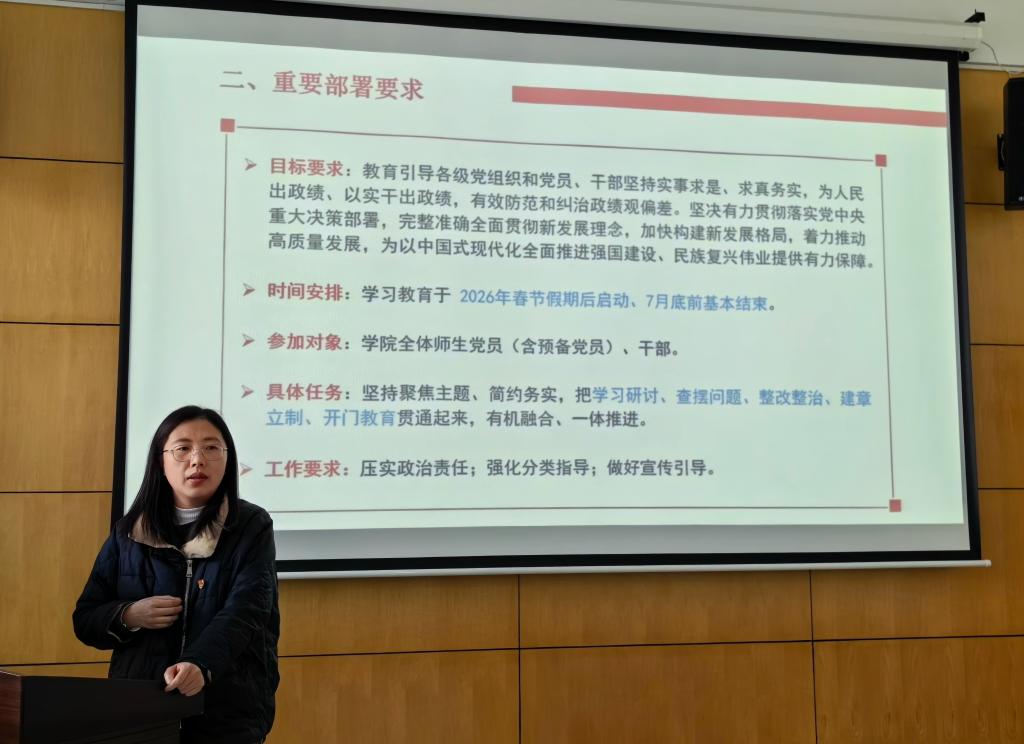 党委书记陆秦首先传达了上级党委关于开展树立和践行正确政绩观学习教育的部署要求。他强调各党支部和全体党员要切实提高政治站位,深刻把握学习教育核心内涵,坚决把思想和行动统一到上级决策部署和学院党委工作要求上来,把开展学习教育作为当前一项重要政治任务。要坚持问题导向,准确把握正确政绩观的实践要求,强化责任担当、砥砺知行合一,推动学习教育活动走深走实。要坚持开门教育,扎实完成好学习研讨、查摆问题、整改整治和建章立制等各项工作安排,为“十五五”开局之年提供坚实保证。专职组织员陆芳就《永利23411集团党委开展树立和践行正确政绩观学习教育实施方案》进行了细化解读,明确相关工作的具体举措、核心内容和时间计划。同时针对2025年度基层党支部组织生活会与民主评议党员工作进行了培训与布置,细化分解组织生活会会前、会中、会后各阶段工作的责任和内容,对相关注意事项进行了重点提醒。