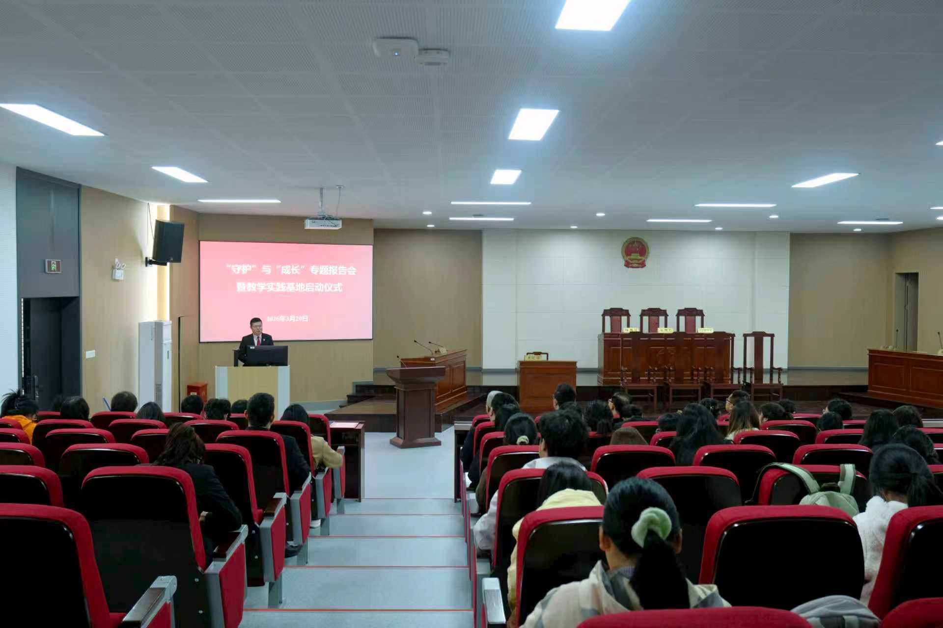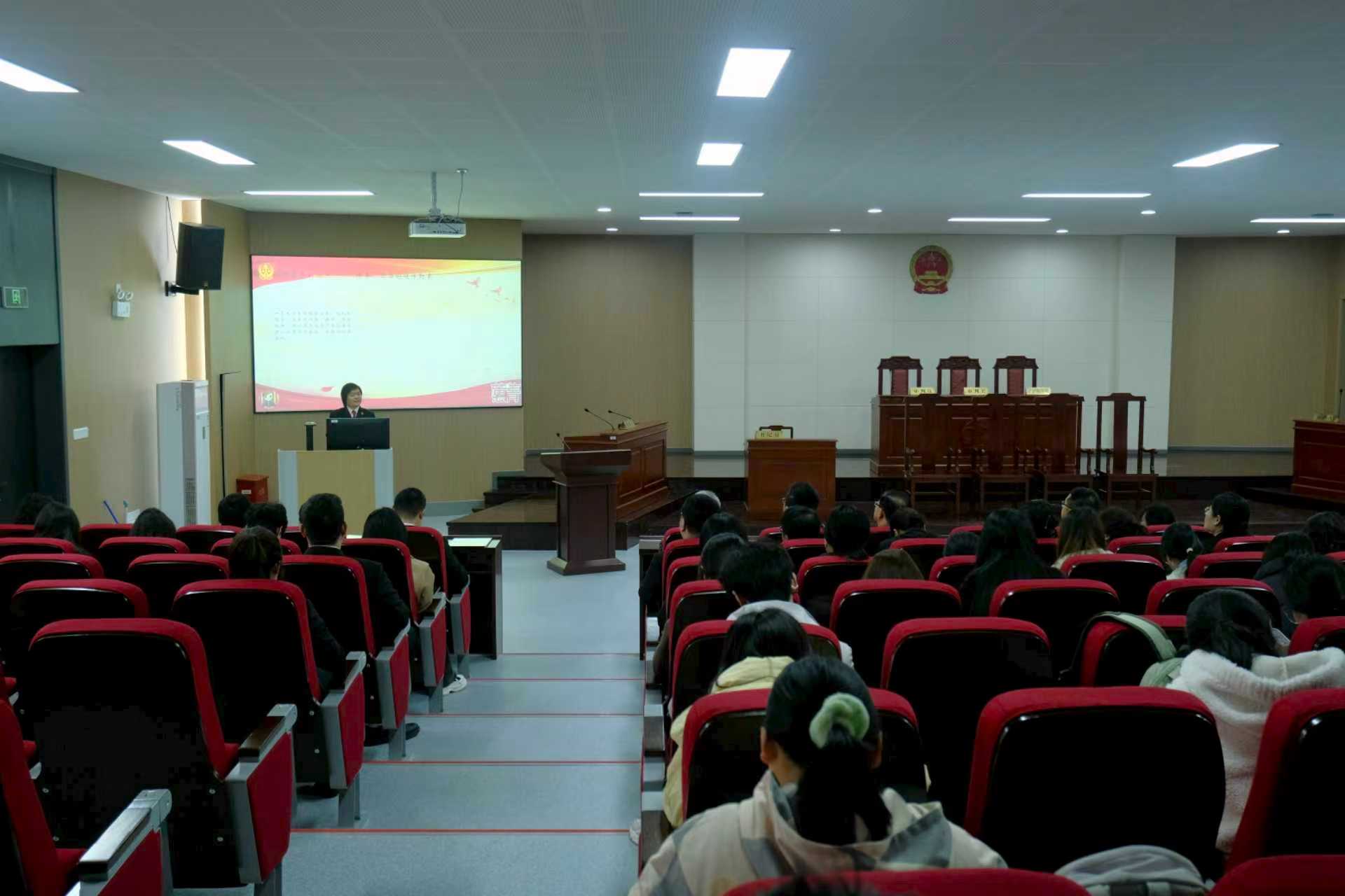随后的专题报告环节,两位实践导师结合自身丰富经验,为师生带来了内容深刻、语言生动的专题报告。刑庭庭长顾溶熔以“案例为镜、法条为尺——用‘法力’守护青春”为题,通过典型案例剖析法律在青少年成长中的护航作用;立案庭庭长薛雨以“法学生的自我提升与成长路径”为题,从学习规划、能力培养与职业适应等角度,为法学学子提供了具有针对性与实践性的成长建议。两场讲座兼具理论深度与实践温度,引发在场师生的热烈反响。