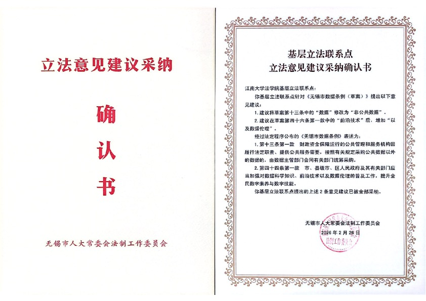 永利23411集团自2022年被无锡市人大常委会法工委确立为基层立法联系点以来,持续优化实体平台功能,完善工作制度流程。积极拓展横向联系网络,深化与立法机关及社会各界的协同,已经与包括无锡市滨湖区人民法院、无锡市新吴区人民法院等在内的50家立法信息采集点建立广泛联系,构建了一个覆盖面广、代表性强、反应灵敏的民意征集网络体系。学院广泛参与无锡市人大常委会推进的地方立法工作,先后出席规范性文件备案审查等立法会议十余次,对《无锡市数据条例(草案)》《无锡市发展规划条例(修订草案)》《无锡市粮油流通安全条例(修改草案)》等关键立法项目,通过专题研讨、广泛调研等多种形式,汇集基层智慧与专业意见,累计提出具有建设性、可操作性的立法修改建议数十条,其中针对《无锡市数据条例(草案)》提出的部分意见建议得到立法采纳,并获得了无锡市人大常委会法制工作委员会的高度评价与肯定。
