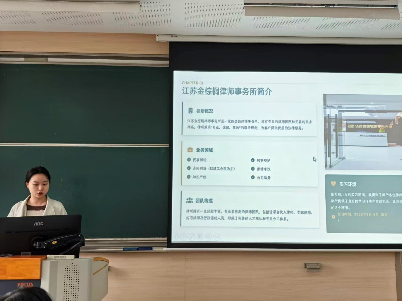 法学专业实习生代表以“从法条到裁判的距离”为题,讲述了在基层法院参与卷宗整理、庭审记录和调解工作的真实体验。她坦言:“在学校模拟法庭上,我们习惯聚焦法律适用的逻辑推演;而在实务中,如何用当事人听得懂的语言解释法律,如何在程序正义与实质正义之间寻找最优解,这些书本上没有标准答案的课题,恰恰是实习带给我们最宝贵的财富。”另一位在律所实习的同学则分享了合同审查和证据梳理中的“细节决定成败”,提醒学弟学妹务必重视文书规范与法律检索能力的日常积累。社工专业实习生代表以“走进服务对象的真实世界”为主线,讲述了在社工站参与困境儿童个案、老年人社区活动和家庭暴力干预工作的心路历程。她提到:现实中的第一个挑战往往是“如何让案主接纳你”。我的督导老师告诉我:‘社工的第一步不是解决问题,而是建立信任’。这句话让我重新理解了专业关系中的尊重与真诚。另一位在精神康复领域实习的同学则分享了应对“情绪劳动”和职业耗竭的自我调适方法,引发在场同学的强烈共鸣。实习指导教师对同学们的交流进行了逐一点评。老师们充分肯定了大家在实习期间展现出的敬业精神和专业成长,同时指出了普遍存在的共性问题:一是文书规范性有待加强,部分法律文书中仍存在引用旧法、格式错误等问题,社工个案记录中主观描述偏多、客观事实记录不足;二是角色边界意识需进一步提升,法学实习生应避免“指点江山”式的过度评判,社工实习生则要警惕过度卷入案主情绪而忽视专业界限。