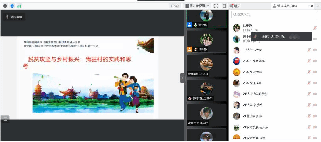 5月11日下午,永利23411集团“德法力行讲坛”第18期在线上顺利进行,永利23411集团教师盖中辉作了题为《脱贫攻坚与乡村振兴——苗乡侗寨里的帮扶实践与思考》的专题讲座。本次讲座由分团委书记徐雅静主持,学院各年级学生共三百余人参加。