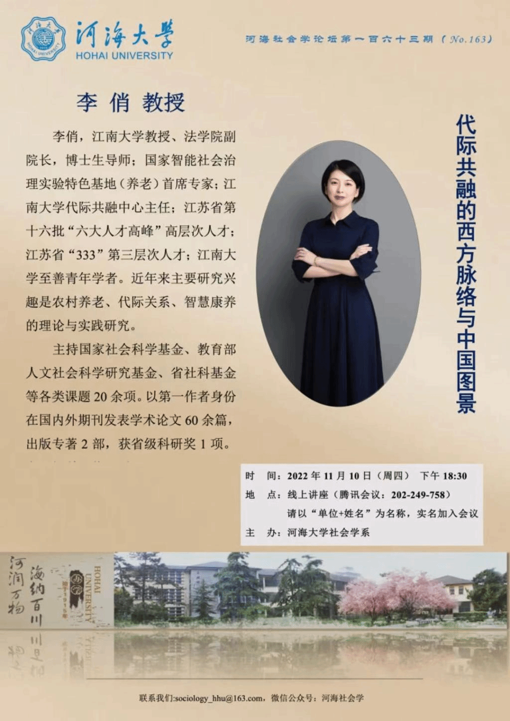11月10日晚,我院李俏教授受河海大学社会学系之邀,通过腾讯会议进行了题为《代际共融的西方脉络与中国图景》的学术讲座。讲座由河海大学公共管理学院副院长陈涛教授主持,李俏教授从问题的缘起、代际共融的内涵、类型与意义、西方代际共融的演进轨迹、中国代际共融的历史传统与现实需求、中国代际共融的实践问题与特色、中国代际共融的发展反思六个方面对代际共融问题进行了深入阐释。