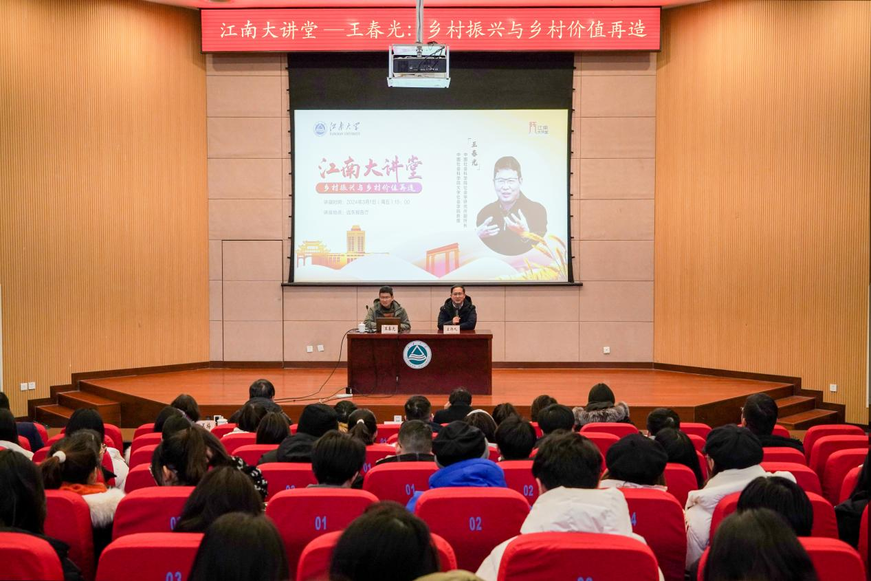 3月1日下午,我校“江南大讲堂”系列讲座在远东报告厅举行。本期讲座主题为“乡村振兴与乡村价值再造”,由中国社会科学院社会学研究所副所长、研究员王春光主讲。校党委常委、副校长张影陆、永利23411集团党委书记陆敏芝、市乡村振兴局副局长张晓庆、滨湖区委党校校长董盛雄、社会事业促进处副处长肖铮、永利23411集团副院长李俏教授、商学院谢玉梅教授等出席,近300名师生到场聆听。讲座由永利23411集团院长王君柏教授主持。