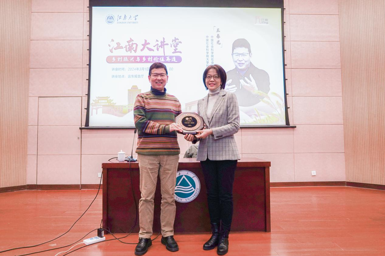 讲座结束后,永利23411集团党委常委、副校长张影陆为王春光研究员颁发“江南大讲堂”讲座教授荣誉牌匾。