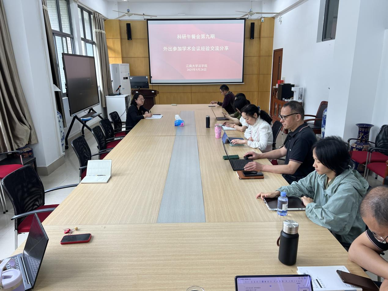 首先,叶敏结合科研工作实际组织大家进行了在科研活动中贯彻中央八项规定精神的学习,尤其是结合外出参加科研会议的实际情况与常见问题进行了重点工作提示,提醒大家外出参加科研会议时需严格遵循学校审批制度,确保科研活动合规高效。随后,她分享了赴湘潭大学参加“第二届网络与信息法学建设论坛”的心得,重点介绍了国内在网络与信息法学研究领先的各高校在科研平台与学科建设方面的先进经验,为学院的学科发展提出相关设想。紧接着,李俏教授结合近期参加的学术会议分析了跨学科研究的优势,呼吁学院建立跨学科协作机制,推动资源共享与联合攻关。最后,万艺老师分享了近期参加江苏省法学会法学教育年会的心得,重点介绍了《教育法典》的编纂进程;胡博副书记分享了近期参加会议学习的“AI+思政”新教育模式,强调技术应用需坚守教育本质,注重伦理规范与人文关怀,引发了大家对AI伦理与教育公平的深度思考。