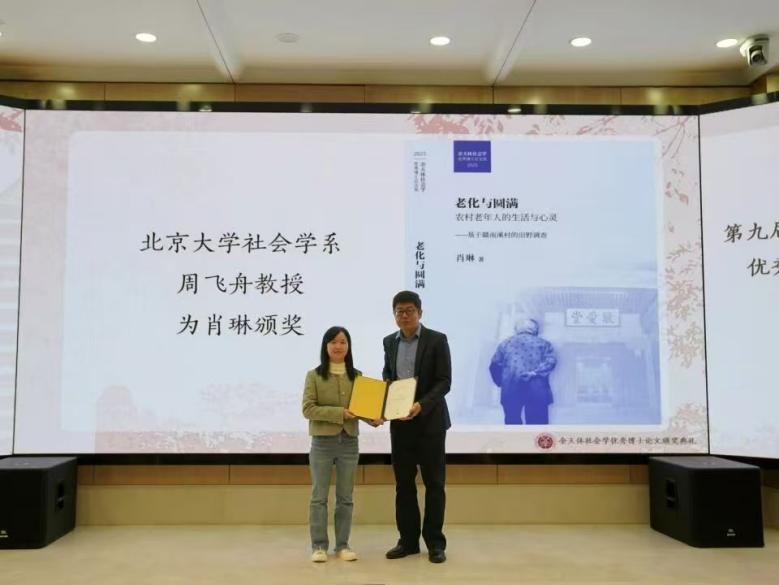 2025年10月,根据《余天休社会学优秀博士论文奖章程》规定的程序,终审评委经过认真的审阅和集中讨论,最终投票选出第九届余天休奖的7篇获奖论文及3篇提名奖论文。其中,我院社会学系教师肖琳博士的《老化与圆满:农村老年人的生活与心灵——基于赣南溪村的田野调查》荣获优秀博士论文奖。11月1日,第九届“余天休社会学优秀博士论文奖”颁奖典礼在北京大学正式举办。北京大学社会学系周飞舟教授为肖琳博士颁奖,赞赏肖琳博士的论文在详实丰富的案例资料基础上对“老化”问题展开投入式理解,开辟了老年研究的新境界。