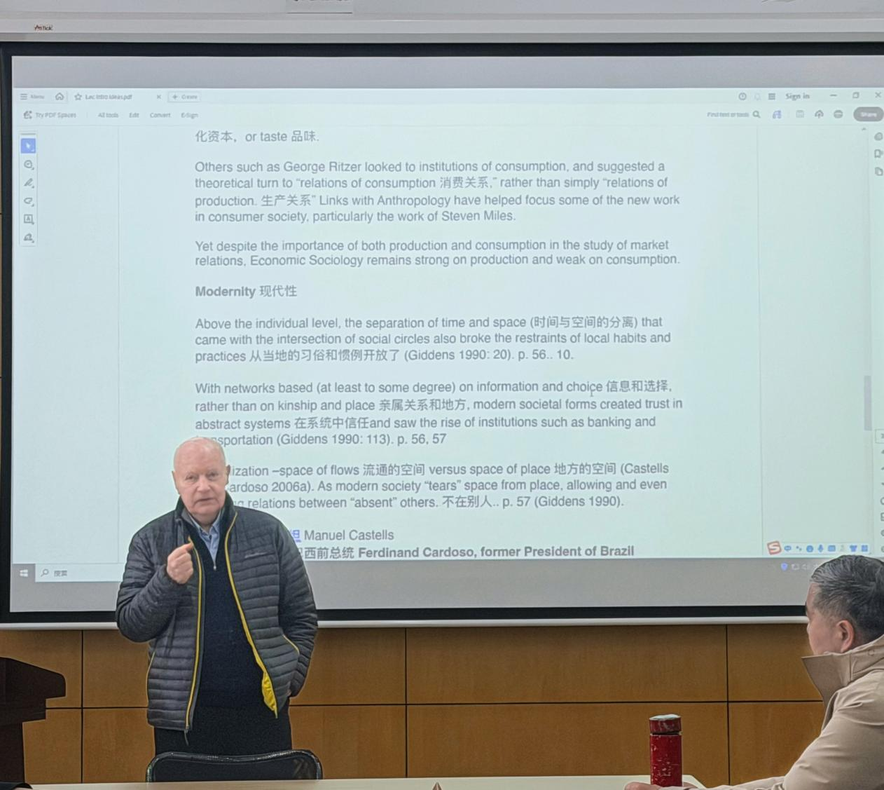 交流会上,叶敏代表学院对学者的到访表示热烈欢迎。随后,孟南水教授围绕“经济社会学的发展与研究重点”内容作学术分享。他回顾了从马克思、韦伯等早期学者对经济基础作用的关注,到当前学界聚焦于经济交换的社会后果与互动机制的范式转变。他指出,全球经济社会学研究正呈现“从西向东、从生产向消费、从富裕社会向发展中经济体”的三大转向,市场在社会结构中的嵌入性成为冷战后研究的核心。他系统梳理了从经典社会网络理论到现代性反思、从生产治理模式到消费社会建构等多元学术脉络,全方位展现了经济社会学在解释当代社会变迁中的理论张力与前沿动态,为在场师生展现了经济社会学在现代性与全球化背景下的广阔视野。